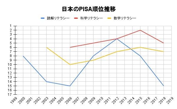 他の2つのリテラシーと比べて2009年以外ずっと順位が低いこと